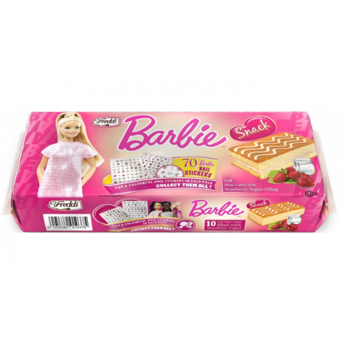 Eight delicious 35g yogurt and strawberry mini cakes plus a card of Barbie stickers in every pack. Made in Lombardy, Italy, by Freddi, the #1 mini cakes manufacturer in Europe.
