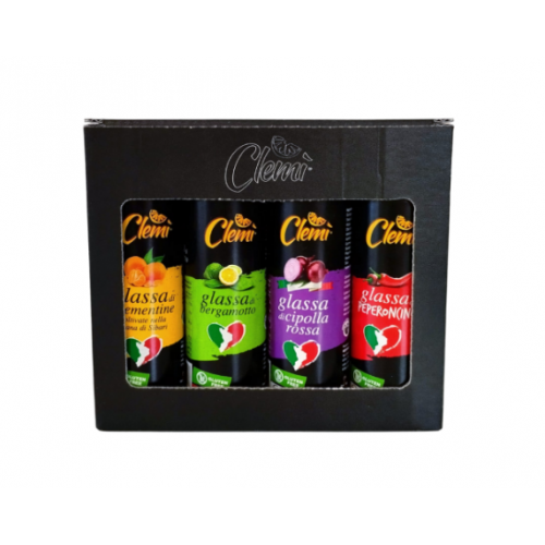 A box set that includes 1x90g Calabrian Hot Chilli Peppers glaze + 1x90g Red Tropea Onion glaze + 1x90g Calabrian Clementine glaze + 1x90g Calabrian Bergamot glaze.